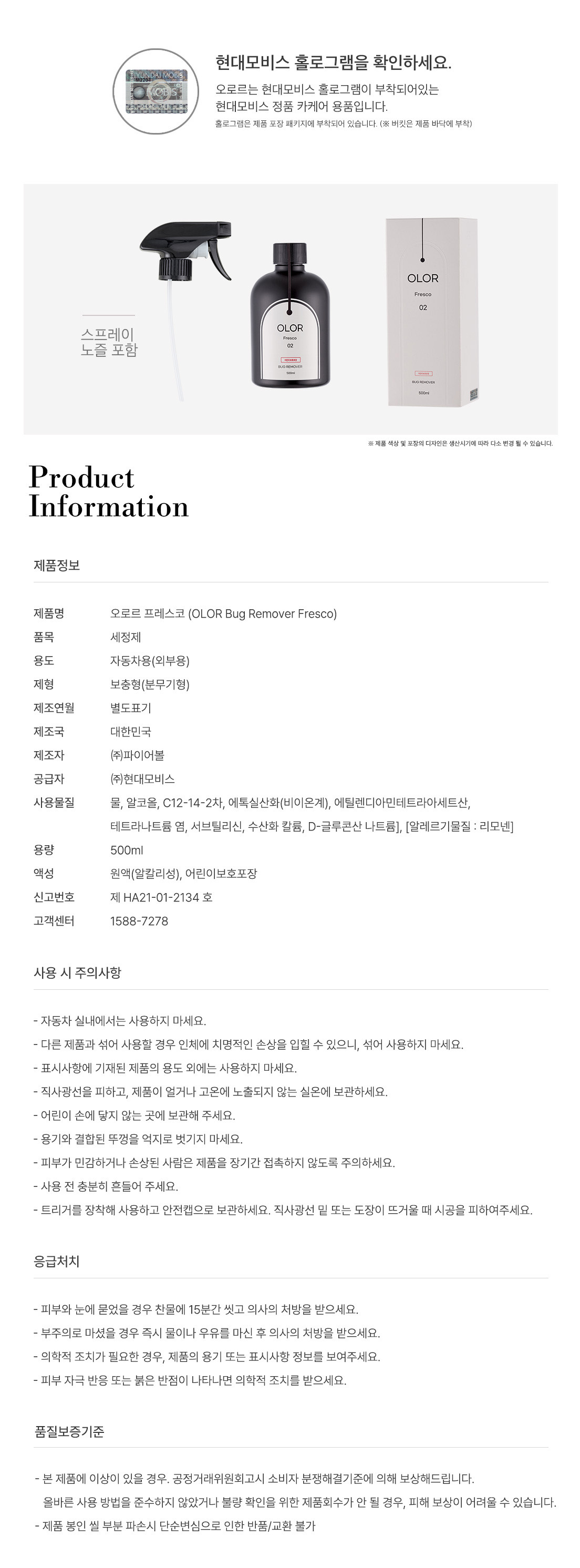 현대모비스 오로르 초간편 벌레제거제 버그 클리너 리무버500ml 프레스코