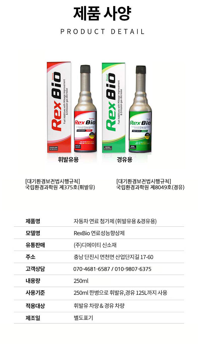 | 품명 및 모델명 | 렉스비오 연료 첨가제 연비 절감제 (경유/ 휘발유 구분) 250mlx3ea |