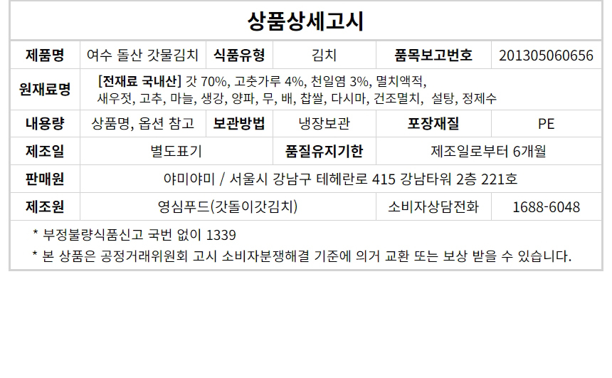 | 농수산물의 원산지 표시에 관한 별률에 따른 원산지 | 상세페이지참조 |